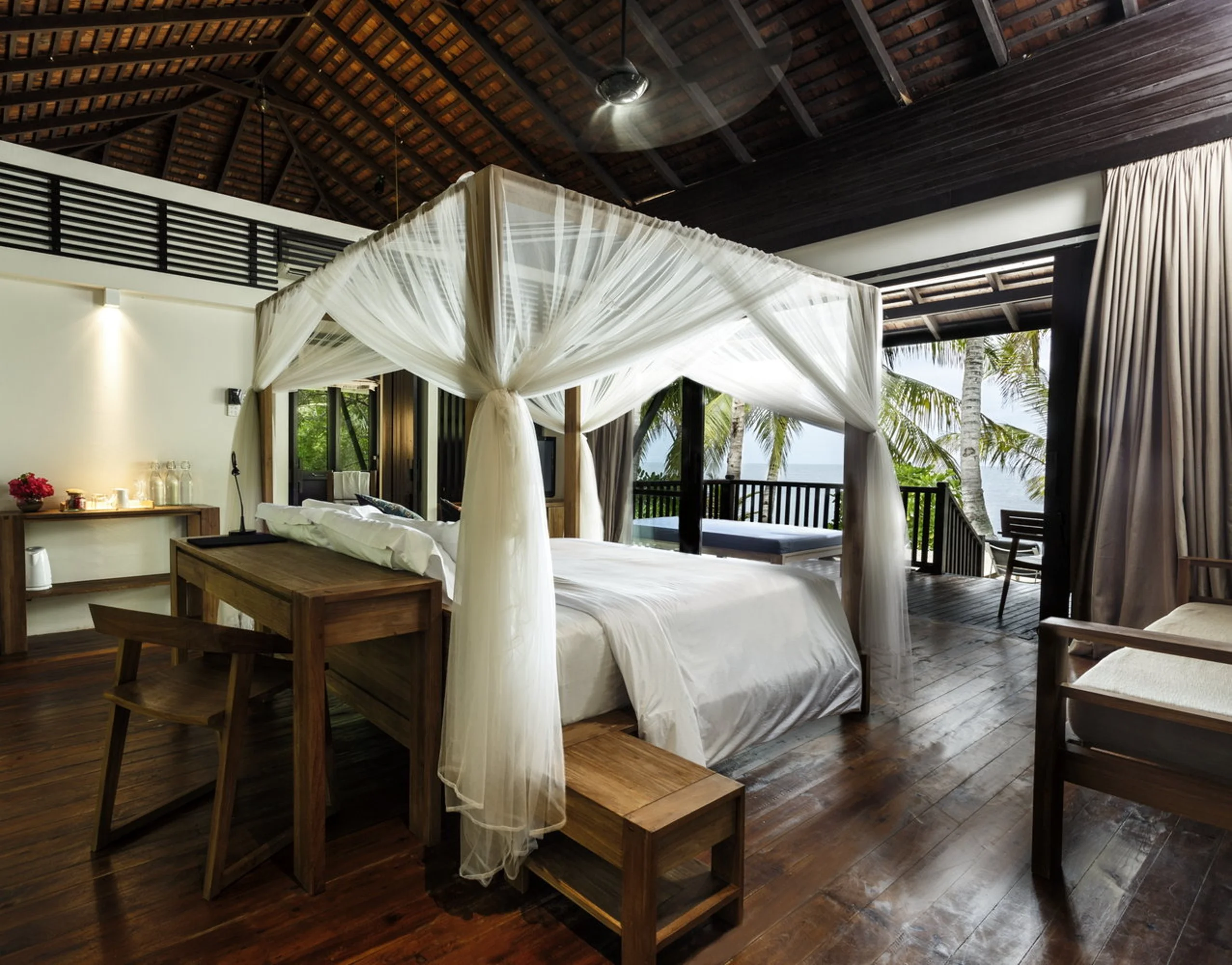 Built with tropical timber, the resort was designed to blend naturally with its surroundings while highlighting stunning island and seafront views. Interiors draw from the natural landscape, combining elegance and comfort to create an authentic island experience. The result is a sustainable luxury retreat that reflects the unique character of Pulau Tengah while offering world-class hospitality.